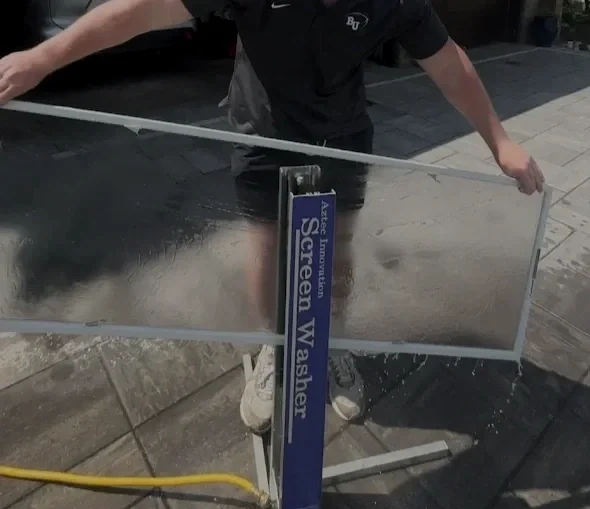 Screens are taken outside and run through our professional water-fed screen cleaning machine connected to a hose spigot. This system cleans both sides of the screen, removing dirt, pollen, and buildup.